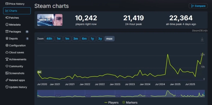 Так, например, было с Danganronpa: Trigger Happy Havoc, обновившей свой рекорд по пиковому онлайну. Аналогичная история приключилась с Detroit: Become Human — киберпанк-драмой о непростых судьбах трёх героев-андроидов.