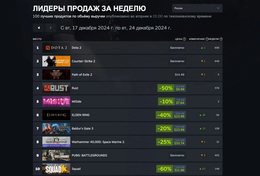 Dota 2 удалось вернуть себе вторую позицию (рост в 11 пунктов), тогда как Path of Exile 2 опустилась до третьего места по сравнению с прошлой неделей. Marvel Rivals тоже потеряла пару позиций — у неё шестая строчка.