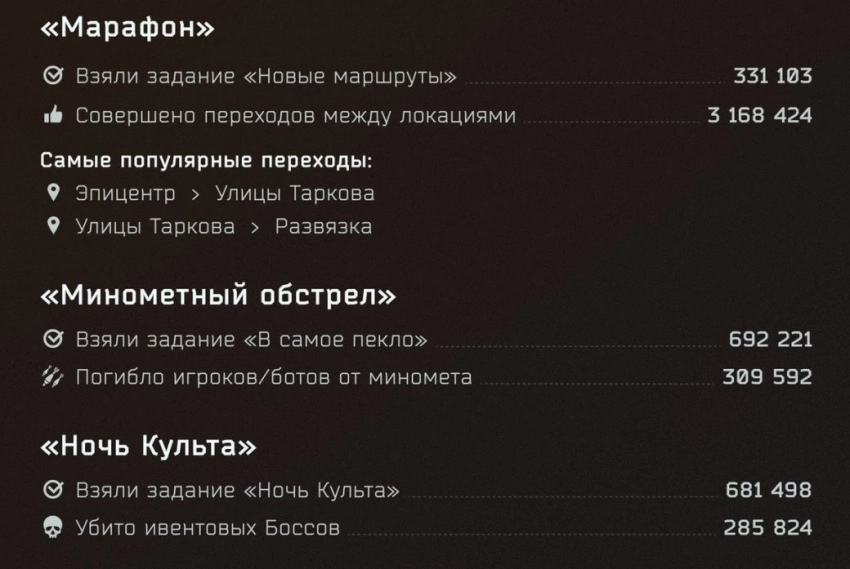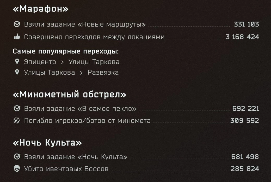 А вот в рамках ивента «Марафон» связанный с ним квест взяли 331 тысячу раз. Эти игроки совершили более трёх миллионов переходов между локациями. Ещё одним событием с крупными числами стала «Контрабанда». В рамках тематического квеста было убито более 1,75 миллиона контрабандистов. Сам квест был взят игроками 474 тысяч раз.