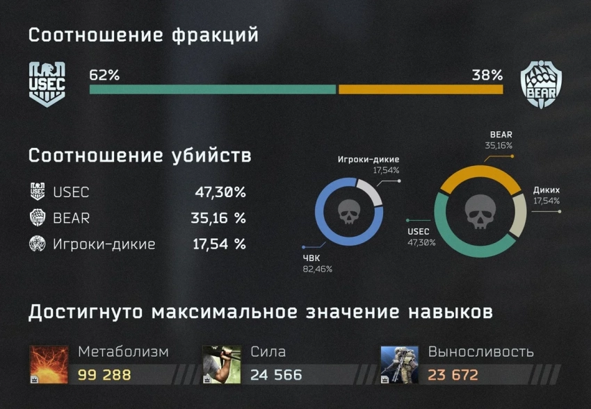 Ещё больше интересных видео на YouTube канале Игромании!Обложка: скриншот Escape from TarkovРазработчики из Battlestate Games поделились статистикой Escape from Tarkov за время патча 0.15.0, который вышел в августе этого года. К примеру, наиболее популярной фракцией оказалась USEC — во время патча её выбрало 62% геймеров. Это отразилось и на статистике убийств — на USEC пришлось 47,30% фрагов.