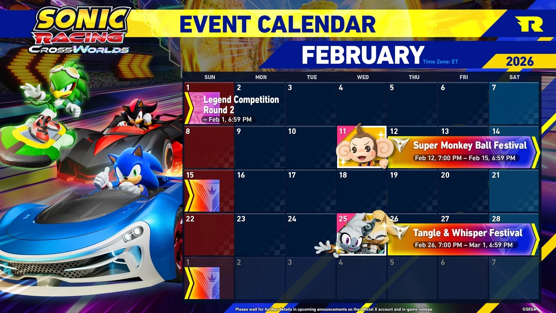 Кроме того, с 12 по 15 февраля в игре пройдёт посвящённый Super Monkey Ball фестиваль — старт в 03:00 МСК. Ожидаются тематические испытания и награды, а также временное отключение сетевого режима «Мировой матч».