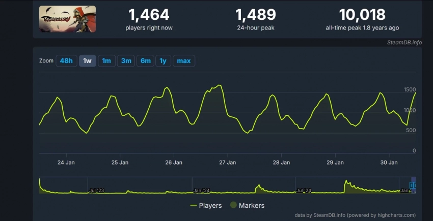Что касается пикового онлайна, то в момент написания новости он составил 1489 человек. За последние дни в рогалике находилось ещё больше геймеров. Возможно, онлайн на фоне обновления возрастёт ближе к вечеру.