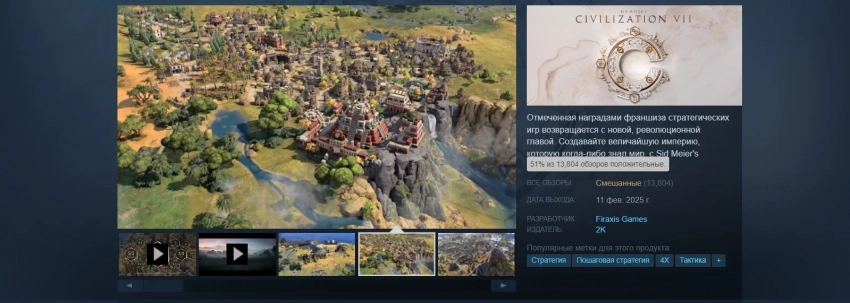 Напомним, что местный пользовательский рейтинг Civilization 7 оказался «смешанным». На новинку написано почти 14 тыс обзоров, из которых только 51% — положительные.