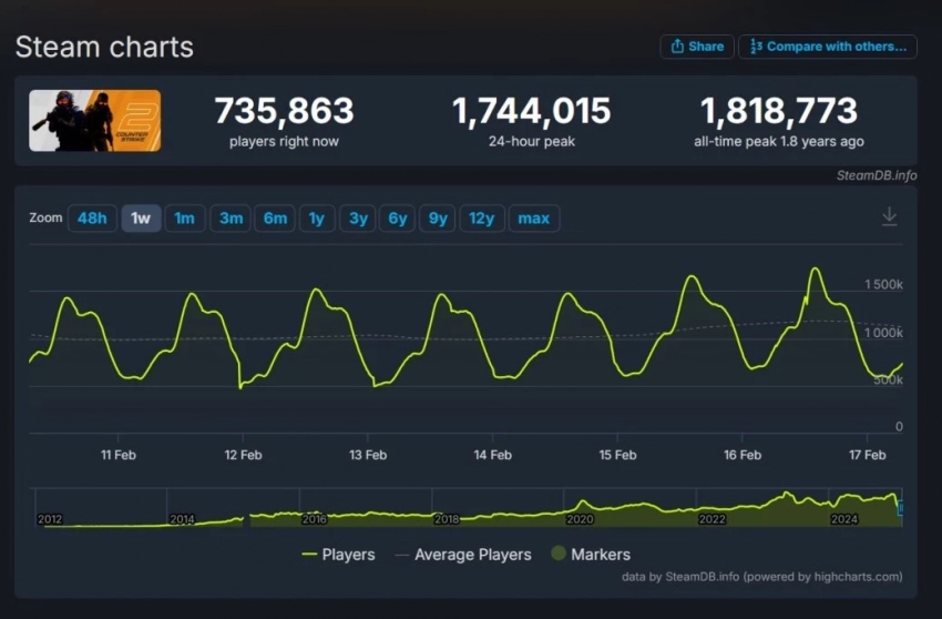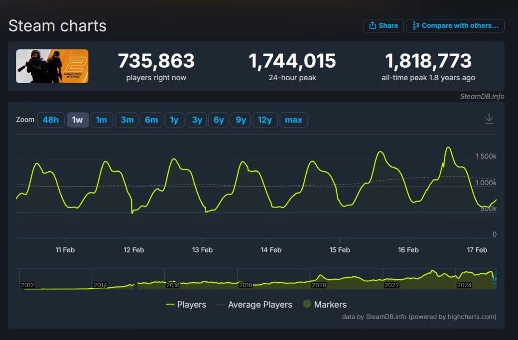 Главные новости » Все об играх » Counter-Strike 2 привлекла почти 1,75 млн игроков одновременно в Steam