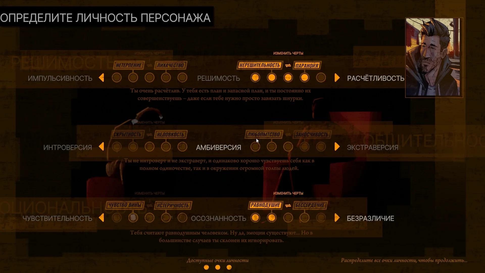 Ролевая игра начинается с создания личности персонажа. За кого мы будем играть? Будет наш герой экспрессивным или холодным? Экстравертом или интровертом? Действовать исходя из сиюминутных желаний или расчёта?.. Распределение очков в самом начале позволит заложить лишь стартовые показатели персонажа. По ходу игры (исходя из наших поступков и происходящих событий) герой может и будет меняться в ту или иную сторону.