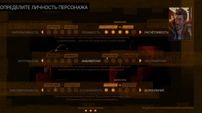 Кроме того, черты характера влияют на мысли, которые отображаются слева сверху. То есть та же паранойя не только открывает дополнительные возможности (или лишает выбора), но и создаёт фон — чтобы лучше понимать чувства персонажа в данный момент.
