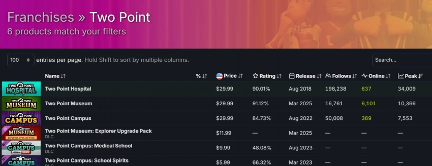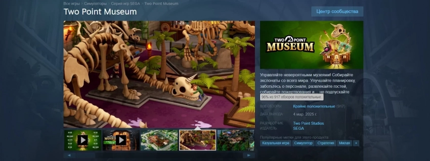Игрокам тоже всё очень нравится. Пиковый онлайн Two Point Museum в Steam превысил 10 тыс человек одновременно. Это меньше, чем у Two Point Hospital про управление больницами (34 тыс), но больше, чем у Two Point Campus про управление университетами (7,5 тыс).