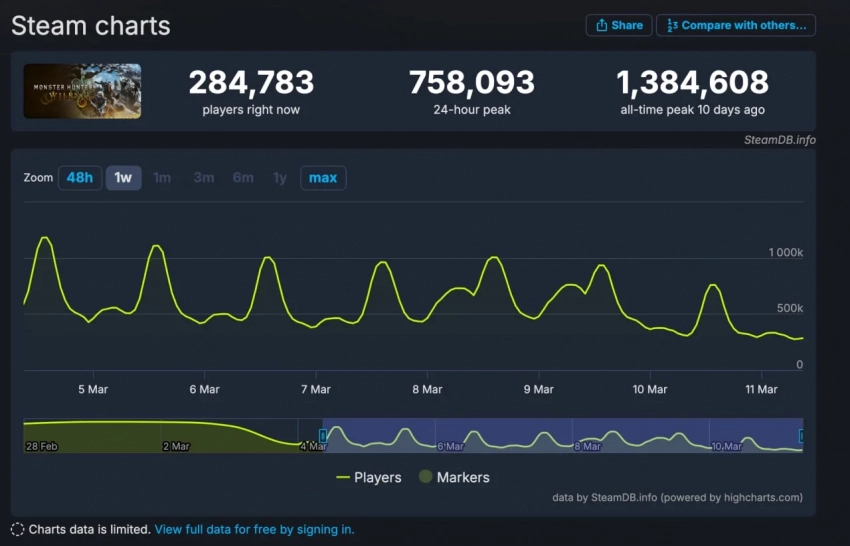 Пик онлайна Wilds за последние 24 часа перевалил за 758 тысяч человек, а на данный момент в проект играют больше 284 тысяч пользователей.