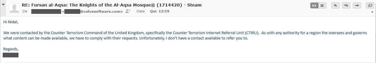 Запрет в Великобритании действительно связан с политическим высказыванием моей игры о конфликте между Палестиной и Израилем. Запрос на блокировку моей игры в Великобритании поступил от подразделения Counter Terrorism Internet Referral Unit (CTIRU). Таким образом, становится ясно, что власти Великобритании считают мою игру «террористической» пропагандой.