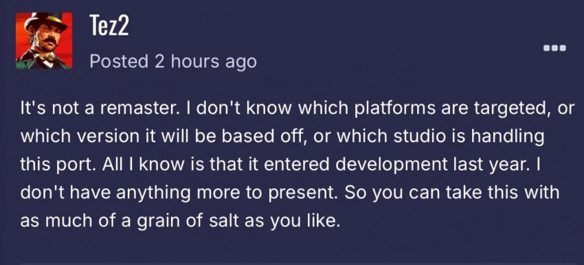 Увы, никакими другими подробностями Tez2 поделиться не может — он попросту не знает деталей. В том числе платформы, взятую за основу версию и студию, которая создаёт порт. Разработка переиздания GTA 4 якобы началась в прошлом году. По мнению поклонников, Rockstar Games хочет заработать денег на фанатах, которые с нетерпением ждут шестую часть и хотят увидеть хоть какие-нибудь новинки.
