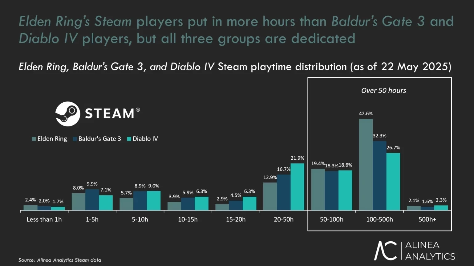 И наглядное сравнение аудиторий Elden Ring, Baldur’s Gate III и Diablo IV в Steam: