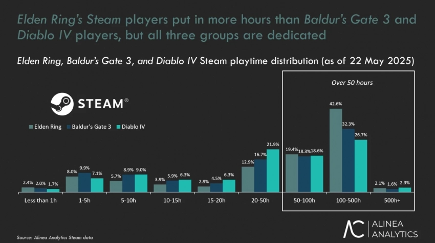 64% игроков Elden Ring в Steam наиграли более 50 часов. На PlayStation столько же наиграли 49% игроков.