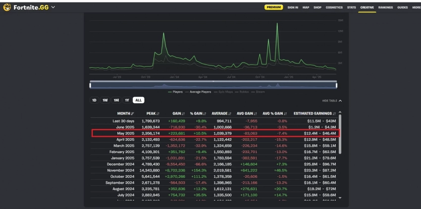 По данным Fortnite.gg, аудитория Fortnite достигла самого низкого числа игроков за последние два года. В мае 2025 года средний онлайн составил 1, 039 млн игроков.