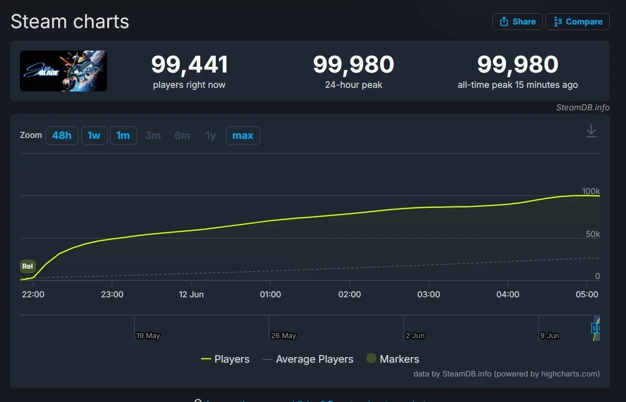 Ещё больше интересных видео на YouTube канале Игромании!Обложка: скриншот игры Stellar BladeПиковый онлайн ПК-версии экшена Stellar Blade в Steam достиг почти 100 тыс игроков одновременно.